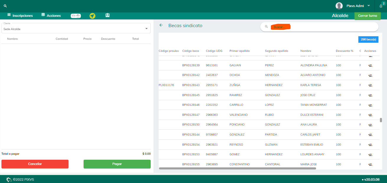 2.- El sistema desplegará en el panel derecho el resumen de las becas registradas donde podrás utilizar el buscador superior para ingresar el nombre o apellidos del alumno que estás buscando.