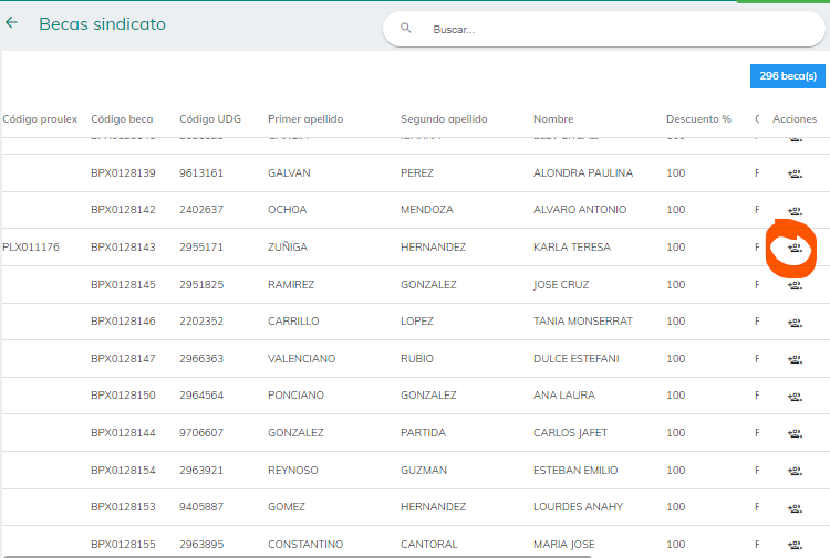3.- Una vez encontrada la beca que se desea aplicar entonces se debe de hacer clic en el icono lateral derecho del renglón correspondiente