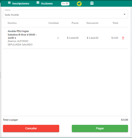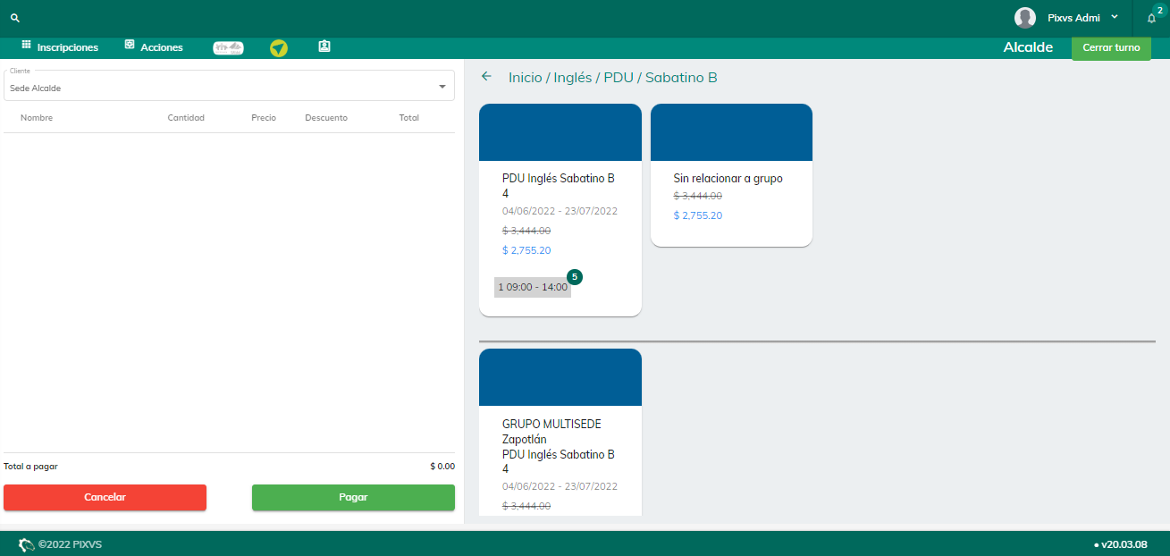 5.- Para finalizar el proceso simplemente se debe seleccionar el grupo al que se desea inscribir el alumno y completar el proceso de inscripción haciendo clic en "Pagar".