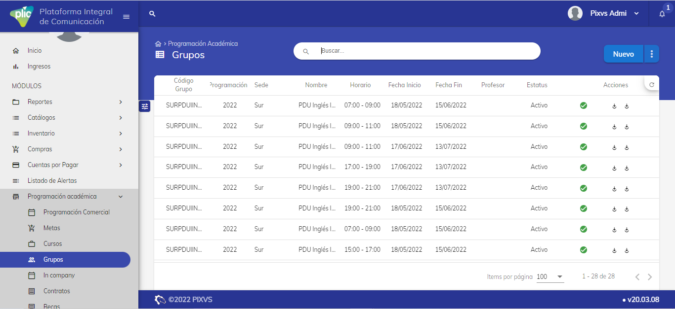 Recuerda que por default el sistema te mostrará los primeros 100 grupos activos que tengas registrados. En caso de requerir el consultar un grupo específico entonces puedes usar los filtros del panel lateral izquierdo.